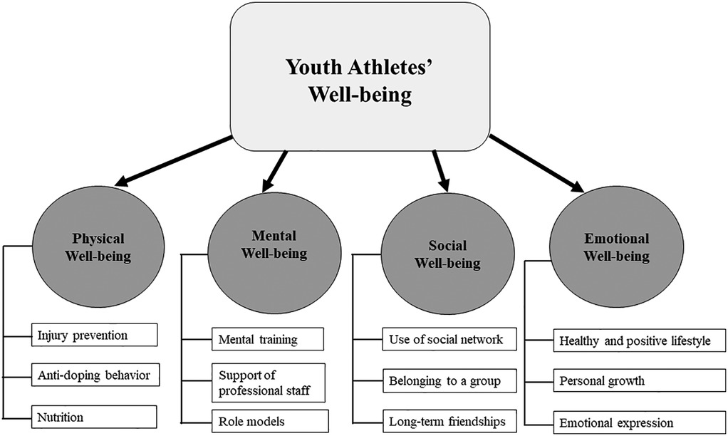 Figure 2 summarizes the key impacts on the well-being of youth athletes based on an adjusted and extended Giles et al. (11) well-being model. The extended model depicts the four original aspects of youth well-being and the three extra components for each produced by our study.