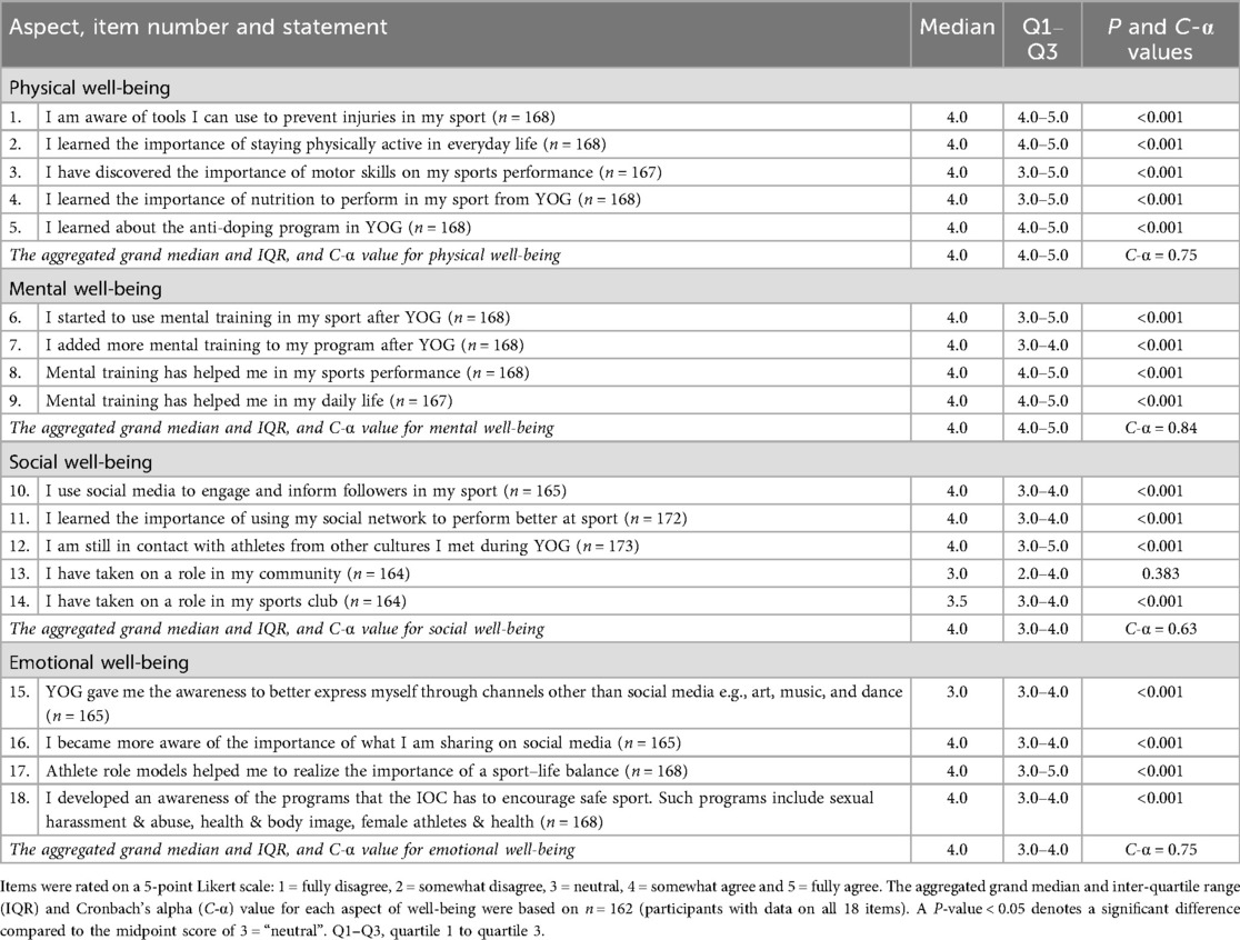 Table 1 shows that internal consistency was relatively acceptable for all four dimensions (Cronbach's α = 0.63–0.84) as only one category, social well-being, fell slightly below the 0.7 threshold. When aggregated, the grand medians indicated positive effects across all dimensions, with values consistently above the neutral midpoint (i.e., above 3 on the 1–5 scale). Physical well-being and mental well-being were the most impacted by YOG participation, aligning with previous studies that emphasize physical well-being as the most examined dimension (1, 4) and that injury prevention tends to be the most impacted and studied direction of YOG athletes' health (39, 40, 68). Female and male ratings were similar for physical well-being [both: median of 4.0 (IQR: 4.0–5.0), P = 0.304], mental well-being [both: median of 4.0 (IQR: 3.5–5.0), P = 0.883], and social well-being [both: median of 4.0 (IQR: 3.0–4.0), P = 0.454]. However, a small sex difference emerged for emotional well-being, with males reporting slightly higher values [males: median of 4.0 (IQR: 3.5–4.5); females: median of 3.5 (IQR: 3.0–4.0), P = 0.009]. The following paragraphs summarize the most critical subthemes for each well-being dimension that emerged from the survey and interview responses.