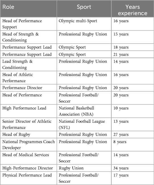 Purposive criterion sampling was used to recruit participants for this study (26). Criteria were as follows: (a) a performance support staff member with a minimum of 5 years' experience in a leadership position with significant decision-making responsibilities, (b) currently working in high-performance sports. Participants were identified in two ways. Firstly, the research study was advertised on social media (Twitter/X) and Linkedin, the professional networking platform, for an 8-week period. Secondly, the authors explored potential candidates within their professional networks (authors have a collective experience of over 40 years working in high-performance sport and a diverse network of professional contacts). Participants meeting the criteria were contacted by the authors.