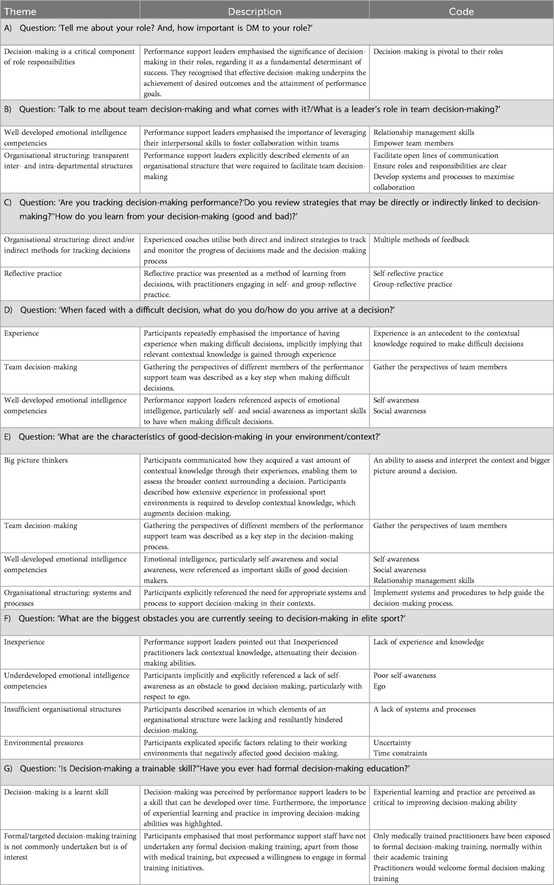 Table 2. Questions, themes, theme descriptions, and codes from experienced coaches decision-making perceptions of importance, processes, obstacles, and enhancing strategies in professional sporting contexts.