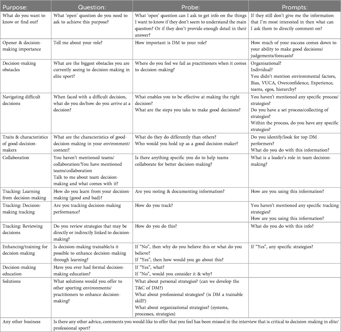 The research study utilised semi-structured interviews (see Appendix 1). The interview guide was developed using the framework proposed by Kallio et al. (27). An initial guide was constructed in line with previous research that identified strategies used by, and characteristics of good forecasters (18, 28, 29). Interview questions were designed to investigate PSLs' perception of the importance of decision-making in their roles (1 question); how PSLs approach difficult decision-making scenarios (1 question); PSLs' perceptions of their decision-making processes individually and in teams (1 question); PSLs views on training strategies to enhance decision-making effectiveness (3 questions); investigate if, and by what means, PSLs monitor the process and outcome of decisions (3 questions); PSLs' perceptions of obstacles that hinder effective decision-making (1 question); and how PSLs characterise good decision-making (1 question). After initial design, the interview guide was sent to a panel of experts (3 individuals with minimum of 5 years' experience in a leadership role in high performance sport with experience of decision-making research). They were asked to assess and provide feedback on whether the questions would effectively capture the facets of decision-making under investigation without leading participants to a particular answer, and whether the structure of the questionnaire was coherent, and the content of each question was clear and understandable. The experts provided feedback, which the authors evaluated using available evidence, to support or reject their recommendations. This process continued until both the panel of experts and the authors were satisfied that the interview guide content was suitable for capturing the relevant information. The final semi-structured interview consisted of 12 distinct inquiries. Each question was designed to delve into a critical facet of the participants' professional roles, perceptions of decision-making processes, and the nuances surrounding effective decision-making in the context of high-performance sport leadership. To elaborate, one question was centred on the participants' specific roles and their perspectives on the intricacies of decision-making. Another query aimed to unveil potential obstacles that may obstruct the decision-making process. The questions further explored the strategies employed by the interviewees when confronted with particularly challenging decision-making scenarios. Additional questions probed the attributes and qualities deemed requisite for adept decision-makers, the dynamics of teamwork and collaborative decision-making, comprehensive approaches to tracking and evaluation, as well as considerations for education and training. A final question, categorised as “any other business,” offered time for participants to share unanticipated or unexplored insights. The interview guide is presented in Appendix Table A1.