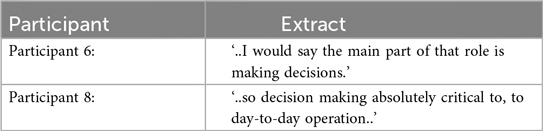 In response to the question “tell me about your role, and how important is decision-making to your role” (Table 2A), PSLs discussed the importance and constant nature of decision-making and referred to decision-making as a key determinant of success. Specifically, all 15 PSLs suggested the importance of decision-making. This is represented in the theme “Decision-making as a critical component of role responsibilities”, which is supported by the following data extracts: