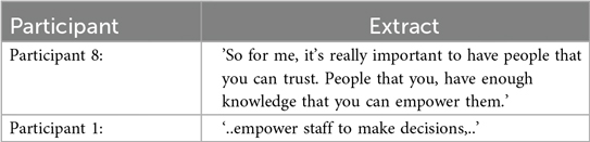 Additionally, social awareness and relationship management were also discussed by PSLs. Both were implicitly or explicitly referenced as important when faced with difficult decisions (Table 2D). Moreover, social awareness was perceived as a characteristic of good decision-makers (Table 2E). Within the social awareness/relationship management domain (Table 2B), building trusting relationships and supporting team decision-making were identified as core pillars. These skills enable PSLs to make decisions that are considerate of both individuals and organisational context; thereby increasing trust, reducing conflict, and promoting team performance (33, 34).
