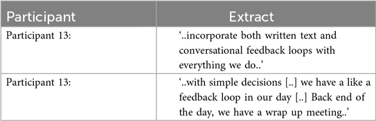 When asked about how they monitor the process and outcomes of decisions (Table 2C), PSLs discussed both direct and indirect approaches. Such methods involved the use of ongoing communication and feedback loops, incorporating live in-the-moment feedback and hot-reviews, maintaining documentation for review, journal keeping, and conducting meetings to further inform the process.