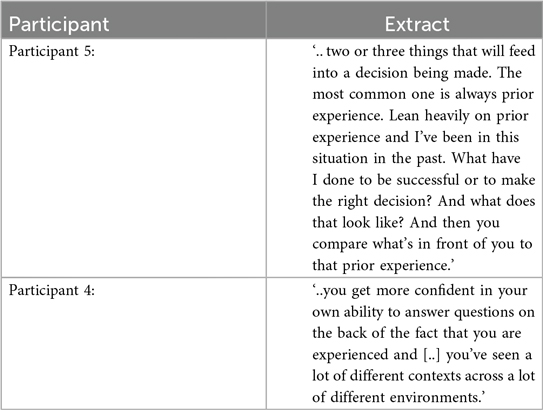Interviewed PSLs considered experience to be a critical attribute of good decision-makers (Table 2E). In contrast, inexperience was thought to impede good decision-making (Table 2F). Experience was viewed as an antecedent to the in-depth contextual knowledge required to make difficult and complex decisions (Table 2D). Such contextual information enables decision-makers to appreciate environmental subtleties, discern amongst nuanced options and subsequently select more contextually appropriate decision options (39, 40).