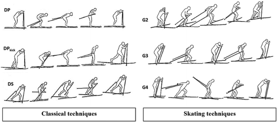 Figure 1. Depiction of cross-country skiing techniques from Herbert-Losier et al. (10) (CC BY 4.0). Left column represents classical technique and sub-techniques of double pole (top), kick double pole (middle), and diagonal stride (bottom). Right column represents skating technique and sub-techniques of G2 (top), G3 (middle) and G4 (bottom).