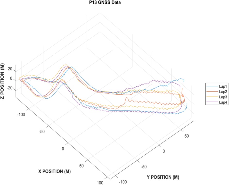 To reconstruct a 3D representation of the cross-country skiing track, the GNSS data from one participant (P13) were used. Specifically, the local x and y coordinates were used in addition to the elevation relative to sea level. Following unit conversion, track revolutions were segmented and demeaned to remove any spatiotemporal drift within the GNSS data. A visual representation of the 3D track topography is depicted in Figure 2.