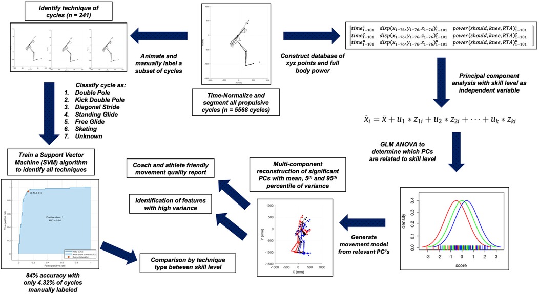 Fundamentally, cross-country skiing performance is defined by the ability of an individual to navigate a track in the shortest period of time. Cross-country skiing performance is affected by multiple potentially interacting and intersecting variables, thereby reducing the utility of analyzing specific sub-components (i.e., joints, or other specific movement features) in isolation (9, 10). Despite this, many previous studies have selected discrete parameters a priori for statistical analysis to infer performance (10–12). Given the dynamic nature of performance, there is a need to evaluate large volumes of time varying data in ecologically relevant (i.e., real-world, over-ground) scenarios. By leveraging tools rooted in data science, data structures can be examined to isolate biomechanical trends related to performance outcomes. One such tool capable of data reduction and feature identification is a principal component analysis (PCA). PCA is a statistical technique that reduces complex data sets into a series of orthogonal patterns of variances called principal components (PCs) (13). It helps to reduce and compare structures of variability within large time-varying datasets, to describe and discern objective waveform characteristics of high dimensionality between subjects or groups. PC scores describe the magnitude and timing variability of each data point obtained along a PC loading vector to understand the degree to which specific patterns of variance are observed (13). A main benefit of PCA in biomechanics is the capacity to use PC scores paired with subsequent multi-component reconstruction (MCR), to reconstruct data along specific modes of variation relating to an area of interest (i.e., performance, injury, etc.), providing the opportunity to develop full-body 3D animated tools for visual inspection. Reconstructing a full-body avatar may be an especially efficient way to provide athletes and coaches with an easy-to-interpret biomechanical analysis, communicating key technical components relating to high-dimensional data such as spatiotemporal kinematics. PCA and machine learning driven analyses have been previously used to examine these various factors associated with cross-country skiing performance (9, 14, 15), as well as across a variety of other human movements (2, 16, 17). PCA can assist researchers in examining a reduced feature set which lacks the redundancy or collinearity often associated with discrete biomechanical outcomes that are selected a priori.