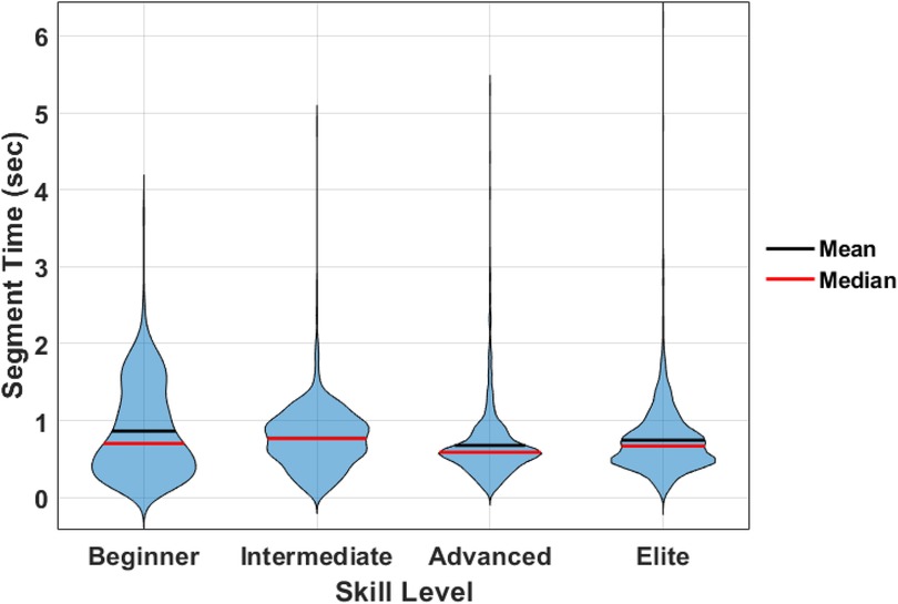 The distribution of skill levels, and segmented propulsion cycles from each athlete are presented in Table 1. Violin plots of cadence characteristics across skill levels revealed changes in the distribution of cycle times across skill levels (Figure 4). Although differences in cycle time distributions existed, there was no significant difference in mean cycle time across the skill levels.