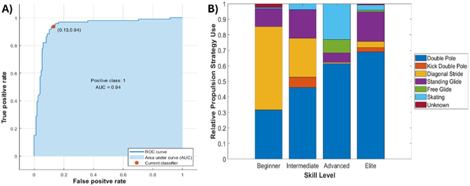 Figure 5. (A) ROC curve for propulsion strategy prediction model. (B) Depiction of propulsion strategies across skill levels.