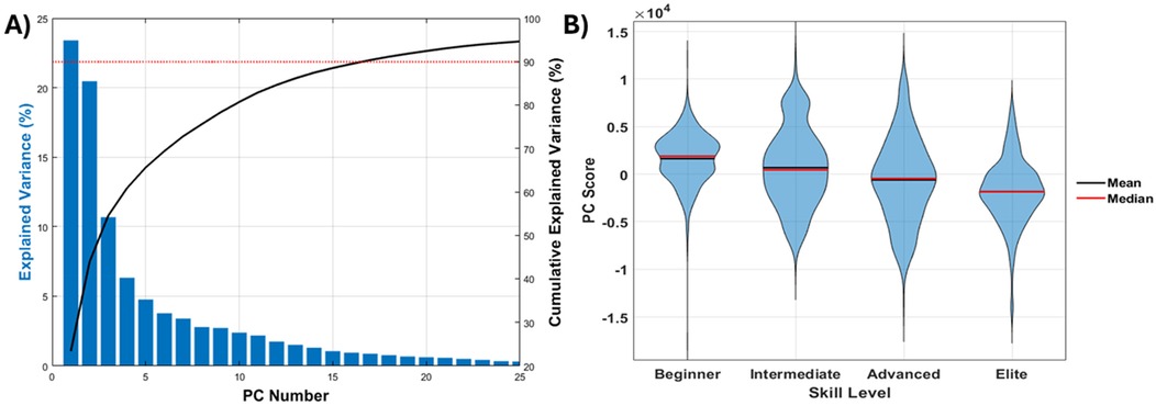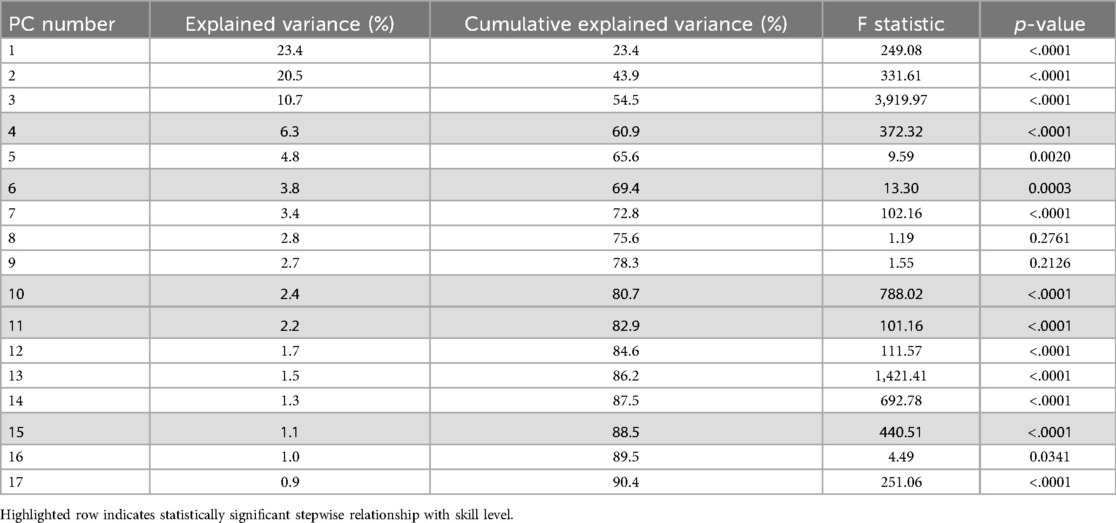 The assessment of the kinematic data included the first 17 PCs which explained a cumulative variance of 90.4% in the pre-processed dataset (Figure 6). A GLM model one-way ANOVA assessing the effect of skill level on the PCs revealed that PC4 (p < .0001), PC6 (p = .0003), PC10 (p < .0001), PC11 (p < .0001), PC15 (p < .0001) were significantly and systematically associated with skill level (Table 2).
