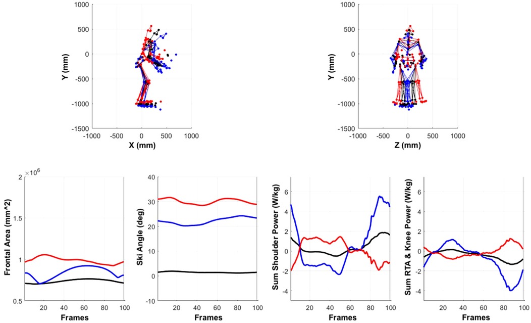 Figure 7. Multi-component reconstruction (PC 4, 6, 10, 11, and 15) depicting whole-body spatiotemporal differences associated with skill level. Red and blue figures represent extremes in variance associated with lower (red) and higher (blue) skill levels. Ski angle was calculated from transverse plane rotation of ski sensor data. Frontal area was estimated as a sum of two rectangular frontal planes derived from the maximum mediolateral and anteroposterior point cloud data (representing the upper and lower body respectively). RTA and knee power are summed together to represent gross lower body power.