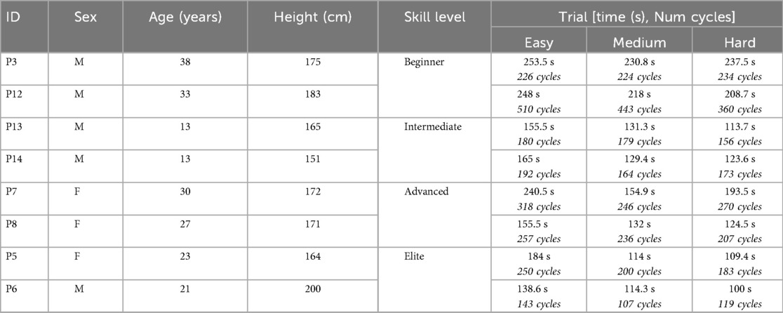 Table 1. Participant demographic information, including the overall elapsed time and number of cycles extracted from each trial across all participants.