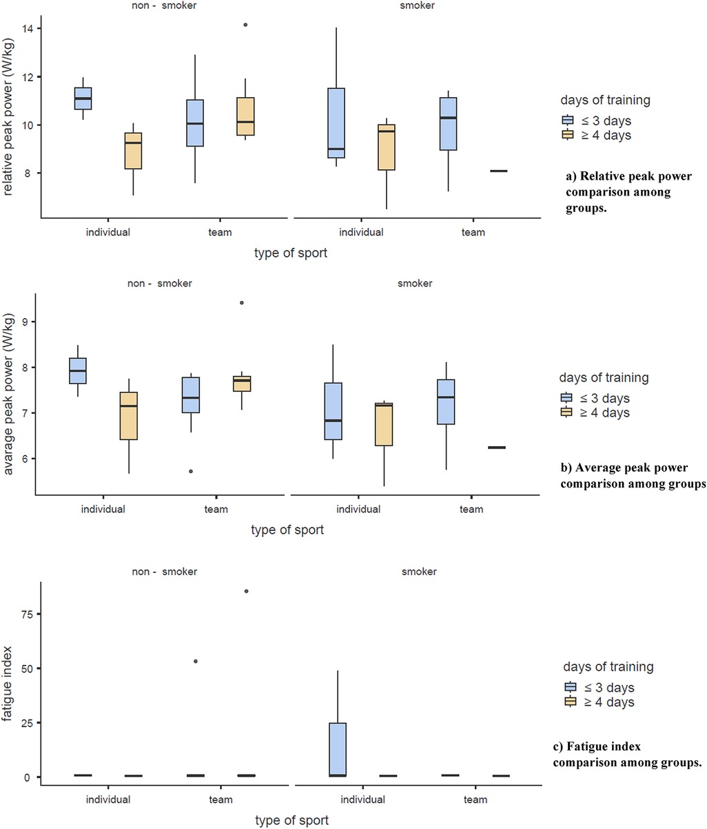 Figure 1. Presents WAnT outcomes [(a) RPP, (b) average RPP, (c) fatigue index] broken down by type of sport, frequency of training, and smoking status. As previously reported, no statistically significant differences were observed across any comparison.