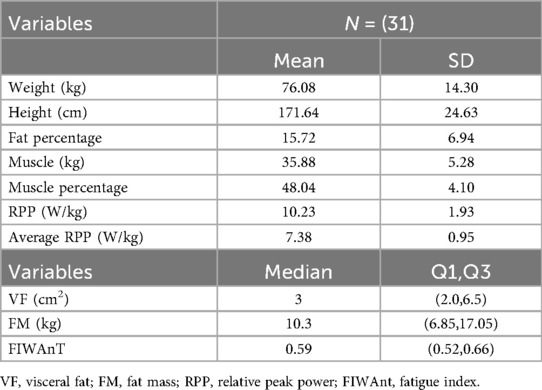 Data from 31 male athletes were analyzed (Table 1). Normality testing using the Shapiro–Wilk test revealed that FM, height, and VF did not follow a normal distribution (p < 0.05).