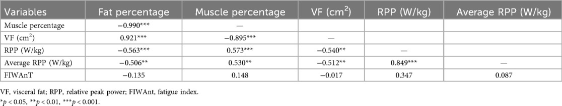 Different correlations between body composition variables were found, and they may collectively influence anaerobic performance. For instance, the strong inverse correlation between fat percentage and muscle percentage is expected, and the strong positive correlation between fat percentage and VF suggests that an increase in overall body fat is linked to higher accumulation of fat around the internal organs, which has been shown to be detrimental to performance (33).