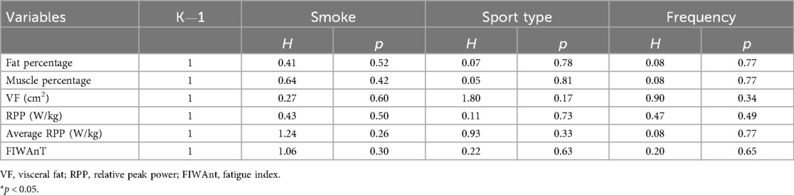 All statistical analyses were performed using Jamovi 2.6.26 (Computer Software, Retrieved from https://www.jamovi.org) (23). The Shapiro–Wilk test was used to check for normality of each variable. Based on that, Spearman's correlation was used for the Variables that were not normally distributed (e.g., FM, height, VF) to find the associations between body composition parameters and anaerobic performance measures. And for group comparisons, the Kruskal–Wallis test was used for the non-normally distributed to analyze WAnT outcomes. While One-way ANOVA was used to analyze FIWAnT, which was normally distributed. Three-way ANOVA was used to investigate the interaction effects between training frequency, sport type, and smoking status on FIWAnT. A significance level of p < 0.05 was set for all analyses.