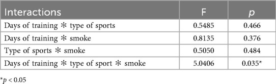 A three-way ANOVA was used for FIWAnT in Table 4. A statistically significant interaction effect was observed between training frequency, sport type, and smoking [F (1,23) = 5.04, p = 0.035], indicating that the combination of these factors influenced FIWAnT. No main effects or two-way interactions were significant on their own (p > 0.05).