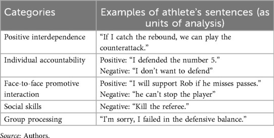 The study was carried out on a basketball team of eleven 13-year-old boys at the beginning of the season, with at least five years of basketball training experience. This team competed in a medium to low-level regional category organised by a regional Federation in a country where basketball is the sport with the second largest number of licences and has achieved very significant international success. The team trained three times per week and played one game per week. Technical, tactical and strategic motor skills training were scheduled, sequenced and cognitively mobilised in the team through CL techniques tailored to team sport coaching. The players were immersed in these cooperative techniques for the first time in basketball training. Multiple and varied CL techniques were used in training and on match days, for example: Elliot Aronson's “Jigsaw Puzzle”, Spencer Kagan's “Time Pair Share” and Ben Dyson's “Learning Team”. But at the same time, the discussion among team members that coach James fostered followed a CL approach to communication to seek a positive emergence of the CL categories in the language of the players.