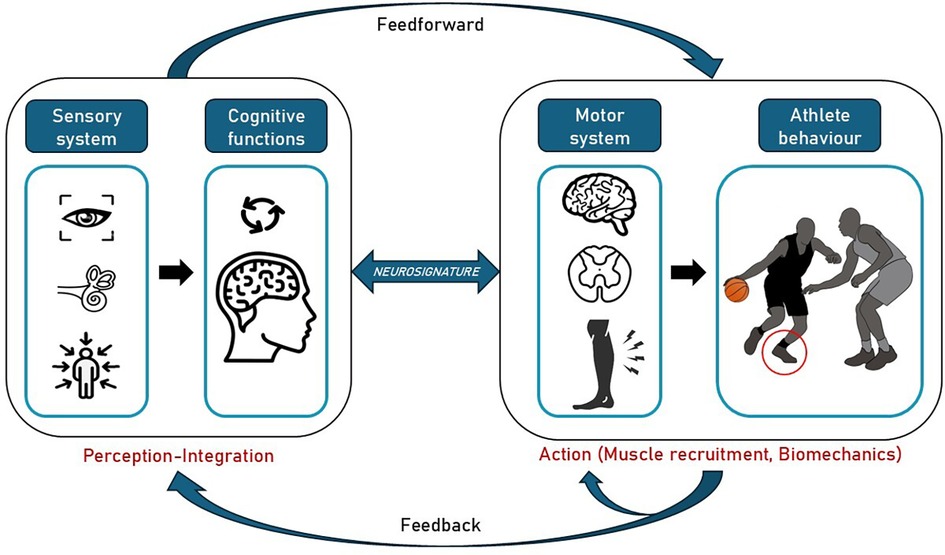 Figure 1. Motor control model driving specific athlete behaviour in a game situation with high risk of lateral ankle sprain. This involves perception of the environment (sensory informations), rapid and effective integration of these cues (cognitive functions), resulting in the production of afferents (motor system) leading to specific athlete biomechanics (action) to the game situation (Neurosignature).