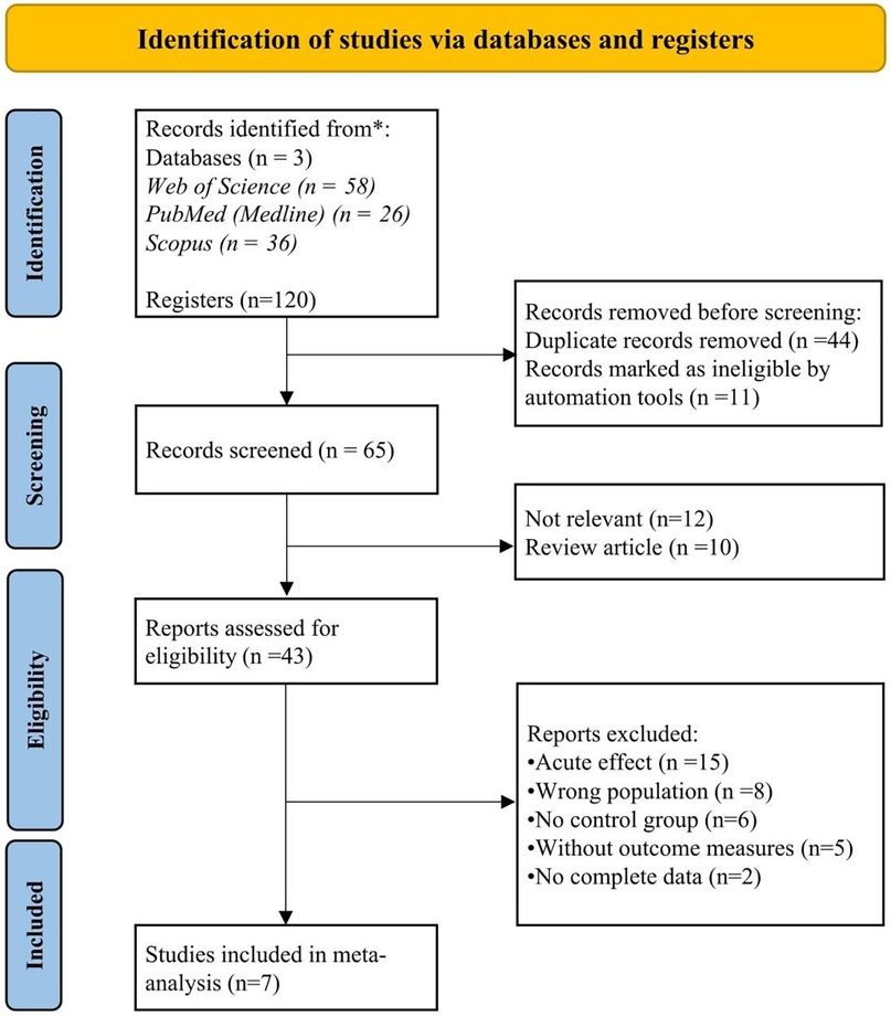The initial search conducted by the first author (I.N.K.V) yielded 120 records related to the predefined study keywords. Preliminary filtering, carried out by the second author (K.P) using an Rayyan automated tool (https://www.rayyan.ai/). removed 44 duplicate entries and 11 ineligible records. Following this step, 65 potentially relevant articles remained (see Figure 1). These records were subsequently screened by authors I.N.K.V and K.G in Rayyan automated tool for relevance based on their titles; in cases where relevance was unclear, abstracts were also reviewed to ensure accurate classification. Titles deemed unrelated to the topic were excluded, although abstracts were frequently examined as an added measure to ensure thoroughness. As a result, 12 records were excluded due to irrelevance, and 10 were excluded for being review articles. The remaining 43 articles underwent full-text screening by authors I.N.K.V, K.G, and C.C.T.C. Of these, 36 studies were excluded for not meeting the inclusion criteria based on PICOS framework or for being published in languages other than English. Ultimately, seven RCTs met the eligibility criteria and were included in the final meta-analysis (Figure 1).