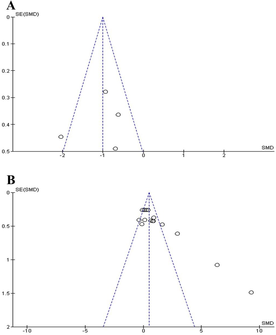 Figure 2. Funnel plots for publication bias assessment on (A) change of direction speed; (B) vertical jump performance.