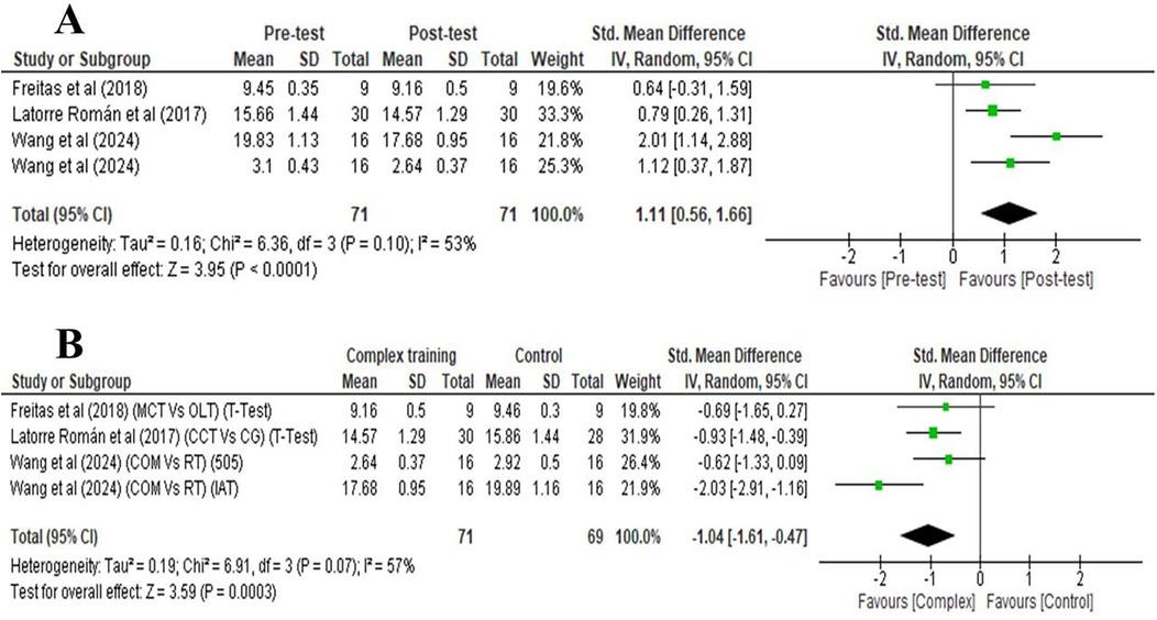 Figure 3. Forest plots depicting CoD outcomes: (A) Pre- and post-test differences following complex training; (B) post-intervention comparison between complex training and control groups.
