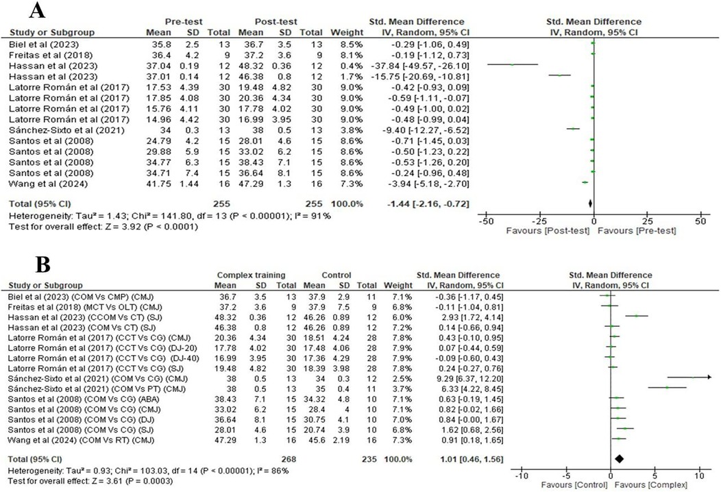 Figure 4. Forest plots depicting vertical jump performance: (A) Pre- and post-test differences following complex training; (B) post-intervention comparison between complex training and control groups.