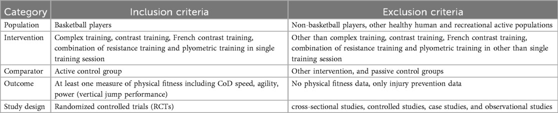 The inclusion criteria for the present systematic review and meta-analysis were as follows: (1) studies involving basketball players as participants, regardless of gender, age category, or performance level; (2) application of CT, contrast training, French contrast training, or a combination of resistance and plyometric training within a single training session as the intervention (39); (3) use of an active control group for comparison, which may include standard training practices, traditional resistance training, plyometric training alone, or other exercise modalities designed for performance enhancement; (4) investigation of at least one measure of physical fitness, including change of CoD speed, agility, vertical jump performance, or; and (5) inclusion of RCTs published in peer-reviewed journals. Articles were included irrespective of publication year, provided full-text access was available. Studies were excluded if they: (1) involved non-basketball players, other healthy populations, or recreationally active individuals outside the sport of basketball; (2) employed interventions other than the specified training types or implemented the combined resistance and plyometric training in a format other than a single session; (3) used passive control groups with no training or minimal physical activity; (4) did not report any relevant physical fitness outcomes or focused solely on injury prevention; and (5) were not RCTs, such as cross-sectional, controlled non-randomized, observational studies, case reports, or studies lacking a clearly defined control group (Table 1). At least three studies were identified for each outcome measure included in the meta-analysis (40, 41). However, due to a lack of eligible articles on muscular strength and linear sprint performance, this outcome was excluded from the meta-analysis.