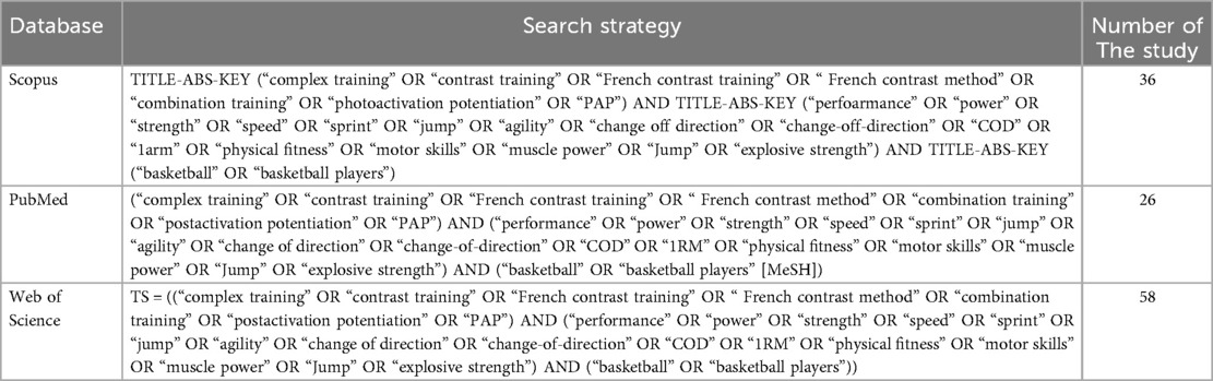 A computerized literature search was conducted on May 09, 2025, using a systematic approach based on the PICOS framework: Population, Intervention, Comparator, Outcomes, and Study design (35). Two independent reviewers (I.N.K.V and K.G) conducted the screening process. The search was carried out across three major electronic databases: MEDLINE (PubMed), Web of Science, and Scopus (36). Studies were included if they involved basketball players (Population); examined complex training, contrast training, French contrast training, or a combination of resistance and plyometric training within a single training session (Intervention); compared outcomes with an active control group (Comparator); and assessed at least one physical fitness parameter such as change of direction speed, agility, power (vertical jump performance outcomes). Only randomized controlled trials (RCTs) were considered (Study design) (37). Detailed selection criteria (Inclusion and exclusion based on PICOS) presented in Table 1 The search strategy included specific terms such as “complex training”, “contrast training”, “French contrast training”, “performance”, “strength”, “speed”, “jump”, “agility”, “change of direction”, and “basketball players”. Boolean logic was used to construct the search queries, incorporating a combination of keyword phrases, MeSH terms, and their logical combinations to ensure a comprehensive and targeted retrieval of relevant studies (Table 2) (38).