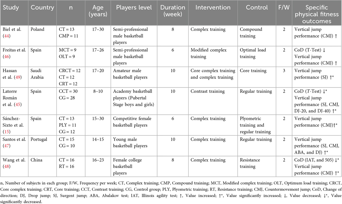 A total of 229 healthy and athletic participants (Basketball players) ranging in age from 8 to 30 years were involved in the seven trials included in this Meta-analysis. Of the total sample, 25.32% were adolescent boys and girls, 29.69% were female, and 44.99% were male participants. The participants were predominantly basketball players at various competitive levels, including semi-professional, amateur, academy-level (pubertal boys and girls), and college athletes, with representation from both male and female cohorts. The average sample size per study was approximately 32.71 participants, and least participants in single group was 9 and most was 30. All trials included two to three study arms comparing complex or contrast training interventions against various control conditions such as regular training, resistance training, plyometric training, core training, and optimal load training. The duration of the interventions ranged from 6 to 10 weeks, with training frequencies of two to three sessions per week (Table 3).