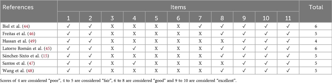 The methodological quality of the seven RCTs included in this meta-analysis was assessed using the Physiotherapy Evidence Database (PEDro) scale, which consists of 11 dichotomous (yes/no) items that evaluate key methodological criteria, including random allocation, allocation concealment, baseline comparability, blinding (of participants, therapists/researcher, and assessors), adequacy of follow-up, intention-to-treat analysis, between-group statistical comparisons, and reporting of point estimates with measures of variability (43). Two independent reviewers (I.N.K.V and K.G) conducted the assessments, resolving any disagreements through consultation with a third reviewer (B.K). Reviewers were not blinded to the study authorship, journal of publication, or study outcomes. The PEDro scores of the included studies were as follows: Biel et al. (44) and Latorre Román et al. (45) scored 6 (classified as good quality), Freitas et al. (46), Sánchez-Sixto et al. (15), Santos et al. (47), and Wang et al. (48) scored 5 (fair quality), and Hassan et al. (49) scored 4 (poor quality. Although scores of 5 and 6 indicate fair to good methodological quality according to PEDro guidelines, they do not reflect full methodological rigor and highlight areas of potential bias or insufficient reporting within the included studies (Table 4).