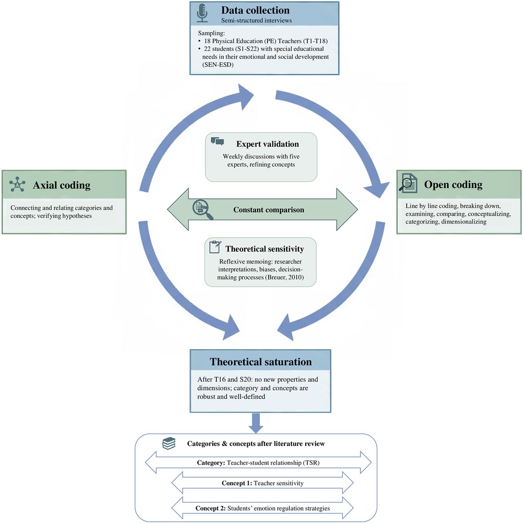 This study employed a Grounded Theory approach following Corbin and Strauss (28), augmented by Reflexive Grounded Theory principles (29), to explore inductively emerging themes in inclusive PE for students with SEN-ESD through constant comparative analysis. Ethical approval was obtained from the institutional review board (Protocols 2024-047 for PE teachers; 2024-048 for students).