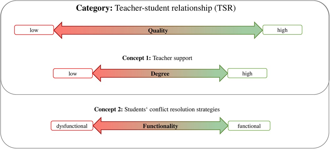 Figure 2. Dimensions and properties of the category teacher-student relationship (TSR) and related concepts.
