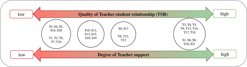 Positively perceived relationships are also characterized by dialogic communication on equal footing, where teachers recognize subjective realities, clarifying perceptual discrepancies. A teacher reflects on the need to reconcile different views of fairness: “children see it differently […] you have to clarify it with them first” (T3, Pos. 25). Students experience this dialogue as validation of their perspectives—“it's not like she just says: ‘that's nonsense’” (S1, Pos. 70)—which fosters trust and positive relationships. Involving students as equal actors emerges as a key aspect of high TSR quality. Intentional inclusivity appears in practices where teachers actively ensure all students are seen and supported: “Our new PE teacher, he really pays attention to EVERYONE4” (S21, Pos. 36). The emphasis on “EVERYONE” contrasts with prior exclusion, while now tailored support “You can take your TIME” (S21, Pos. 36) fosters agency and attempts at new tasks, reflecting a balance between autonomy and structured support.