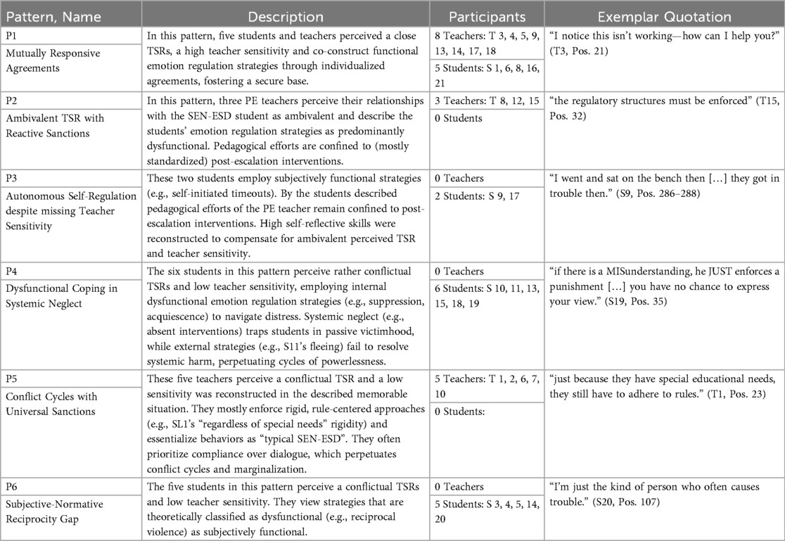 Teachers in P5 “Conflict Cycles with Universal Sanctions” exclusively described dysfunctional, externalizing behaviors (e.g., “throwing wooden objects”), which in this study can be explained through their tendency to prioritize observable disruptions over asking students for their view, internal struggles or needs. This oversight is validated by students in P5, who urge teachers to “listen to both sides” (S20, Pos. 107), reconstructing the students' feeling of exclusion from the conflict resolution process.