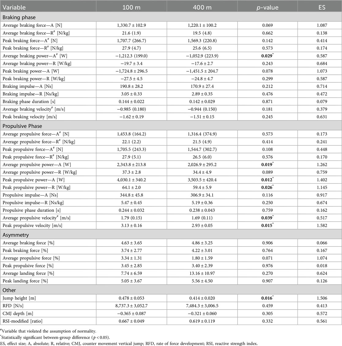 The descriptive statistics (means and standard deviations or medians and interquartile ranges) for each force-time metric and asymmetry measures examined in this study are presented in Table 1. Between-group statistically significant differences were found in average braking power, average propulsive power (absolute), peak propulsive power (absolute and relative), average and peak propulsive velocity, and jump height, with each variable being greater in 100 m sprinters compared to their 400 m counterparts.