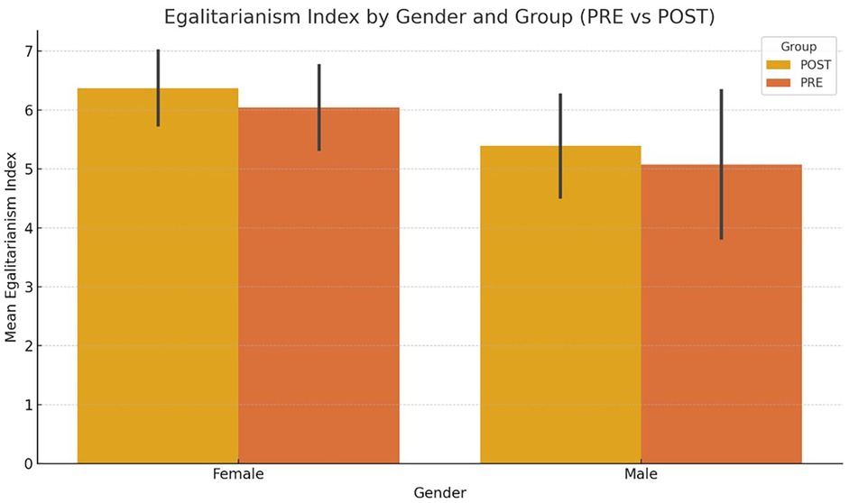 Although the difference is not statistically significant (p = 0.184), the post group shows a higher average Egalitarianism Index score (+0.51). This suggests a possible positive effect of the intervention on attitudes toward gender equality, especially considering the small sample size. In the post group, women show high and fairly consistent levels of egalitarianism (averages between 6.31 and 6.50).