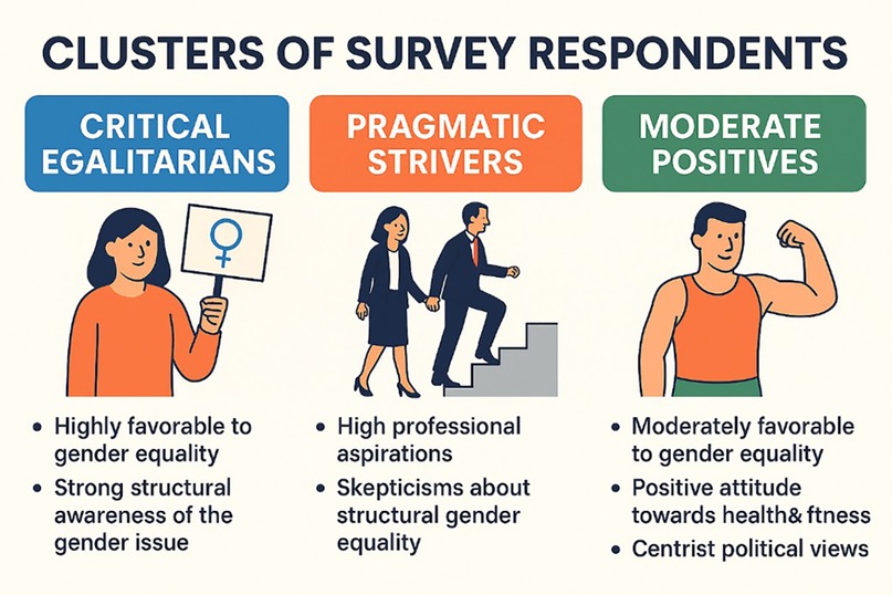 • Cluster 1 – “Aspirational egalitarians”: Maximum support for structural equality, female objectivity, and personal ambition. Highly egalitarian and very motivated to take on leadership roles. Higher ideological level (10), but surprisingly progressive. Represents a powerful new profile compared to the pre one. Previously, there was biased leadership, but now equality and ambition are integrated.