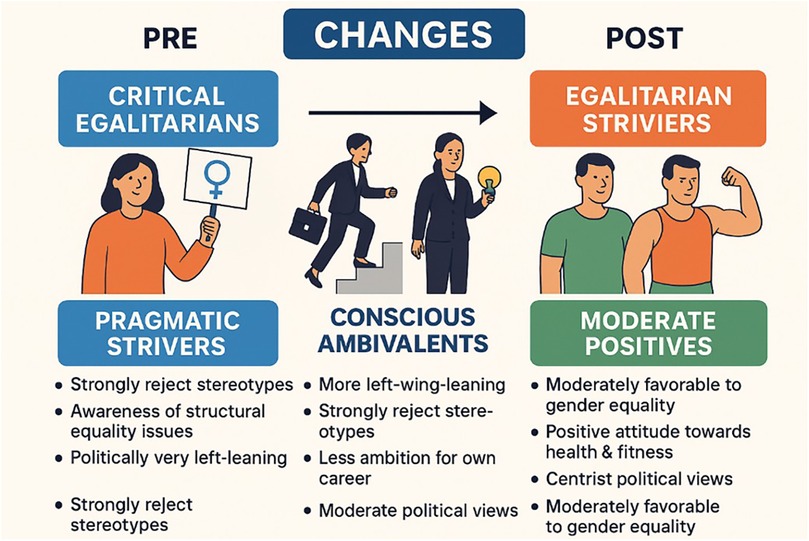 • Cluster 2 – “Traditional with nuances”: More lukewarm support for equality (e.g., 5 on "structural problem"). They show residual stereotypes (3 in female inferiority, 4 in “pregnancy counts”). Low personal ambition. Very similar to Cluster 3 of the pre. Retains some resistance to change.