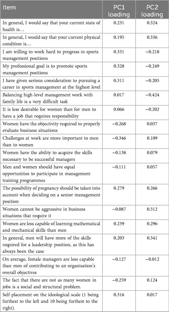The interpretation of each principal component was based on the loadings of the original items (Table 1). For instance, items related to gender equality beliefs loaded strongly on PC1, suggesting this component represents a dimension of egalitarian attitudes. Meanwhile, items linked to career aspirations and leadership potential contributed notably to PC2, indicating a motivational or ambition-related dimension.