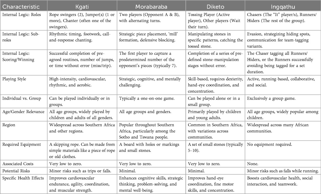 To improve clarity and provide a systematic overview, the Table 1 summarizes the key characteristics of the four indigenous games discussed in this paper: Kgati, Morabaraba, Diketo, and Ingqathu. This comparison highlights their potential as culturally relevant and multifaceted tools for public health interventions.