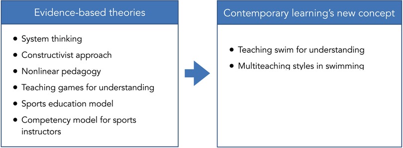 Some theoretical models are more suitable for addressing the contemporary methodological approach to teaching swimming and deserve to be explained: the educational systems thinking (8), the constructivist approach to teaching (9), non-linear pedagogy (10), teaching games for understanding (TGfU) (11, 12), the sports education model (13), and competency models for sports instructors (14).