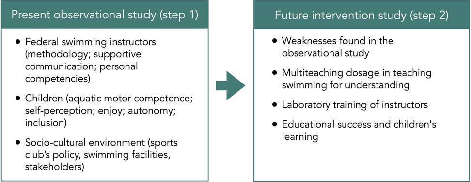 Considering the aforementioned aspects (Figure 1), the direction of our research, after an initial preliminary analysis aimed at collecting data on the methodological approaches of the swimming instructors and the effects of their teaching (Figure 2, Step 1 = the present study), will be extended to other elements of the systems thinking (Figure 2, Step 2 = future study). They include the training of instructors provided by a university's staff aimed at the overall development of the child and their skills (41, 42), also in a cognitive and psychosocial contexts based on teaching swimming for understanding and to the appropriate use of multiteaching styles considering the specific characteristics of the environment.