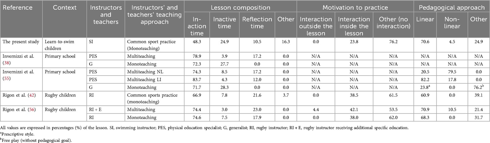 The observation of the lessons, based on inter- and intra-rater reliability, showed excessive time spent by instructors in managing collective actions (e.g. departures one at a time while the other children are still; attention focused on some children while the others are inactive), which implies dead and inactive times (24.9% of the lesson). Compared to previous studies by the present research group, which analysed teachers' conduct while teaching in different contexts but under a similar scientific investigation approach (38, 42, 55, 56), the SI appear to spend more inactive time than physical education specialist teachers (PES) and instructors of other sports (RI) (ranging from 3.9% to 8.5% and from 3.0% to 7.8%, respectively; Table 1). Conversely, swimming instructors' inactive time (SI), as reported in the previous studies, was approximately 2.8%–3.4% lower compared with the generalist (G) teachers. Although these data represent an important indication of the need to reduce downtime, they must nevertheless be normalized in the aquatic context. It is interesting to note, however, how a multiteaching and multi-activity approach generally significantly reduces this type of timing (38, 42, 57, 58). Specifically, in rugby instructors, inactive times reduce from 7.5% to 3.0% (56).
