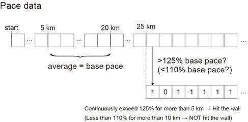 For this dataset, we developed an operational definition for identifying “hitting the wall” (HTW) based on the pace profiles (Figure 1), drawing upon methodologies from previous studies (5, 6). This phenomenon was assessed by analyzing the degree of slowdown during the latter stages of the race. Specifically, we defined the average pace from 5 to 20 km as the “base pace”, excluding the initial 5 km segment as pacing can be erratic during the very early stages of a marathon. The “relative pace” for segments after 25 km was calculated as the ratio of the segment pace to the base pace. A race was then classified as “hit the wall” if the relative pace profile continuously exceeded 1.25 (indicating a slowdown of more than 25% compared to the base pace) for more than 5 km. This criterion aligns with the operational definition adopted by Smyth (6), which was established through a sensitivity analysis on a large-scale dataset of over 4 million race records. Smyth (6) also notes that these thresholds are comparable to similar criteria proposed by Berndsen et al. (5), which included slowdowns of approximately 17% over more than 5 km. On the other hand, a race was labeled as “NOT hit the wall” if the relative pace was consistently less than 1.10 for more than 10 km, indicating that the runner largely maintained their pace throughout the race. This threshold is grounded in the general understanding in pacing studies that any pace variation within 10% of the mean race pace is considered to be maintaining pace. A continuous duration of more than 10 km with such a minimal slowdown suggests a sustained and controlled effort. Consequently, races that do not fit either criterion were excluded from the data. For these labels, we considered constructing the prediction model that classifies whether the runner hits the wall.