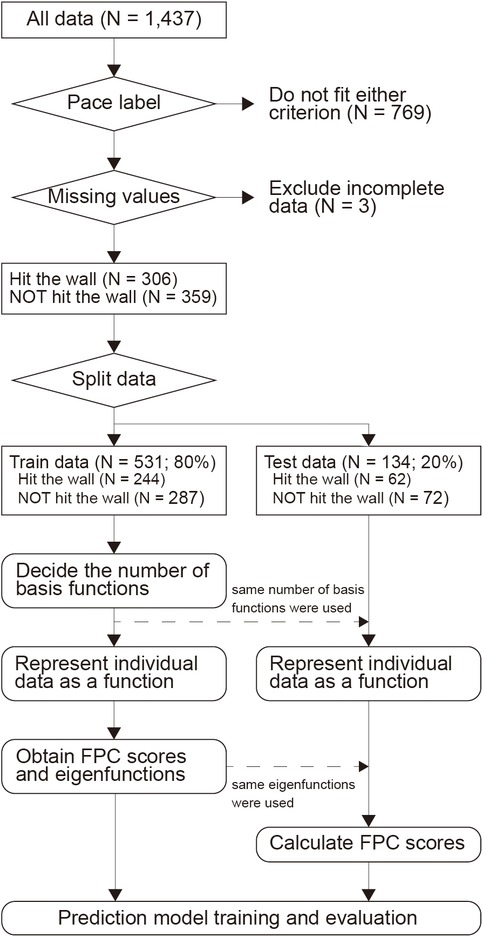 After the pace labels were classified, data preprocessing was conducted as shown in Figure 2. Data with missing values in any running form variables was excluded from further analysis. The whole dataset was split into training (80%) and test (20%) sets using stratified random sampling to maintain the same distribution of gender, finish time, age, and pace labels in both sets. Before applying the classification model, we utilized functional principal component analysis (FPCA) on the time series data, measured in the races. FPCA can represent the time series data in a low dimensional form. To apply FPCA, the measured time series data were smoothed by using B-spline basis functions (28). The number of basis functions was determined using generalized cross-validation for each variable, and the data for each individual were subsequently represented as a function. This functional representation allowed us to handle data with different sampling intervals in a unified manner. Before applying FPCA, the functional data were standardized by subtracting the mean and dividing by the standard deviation calculated from the training dataset. The same standardization parameters from the training data were applied to the test dataset to ensure consistent scaling across both sets. Then, FPCA was applied to the functional data and we can obtain functional principal component (FPC) scores that represent the feature of the function by a low-dimensional vector. The number of FPCs was determined based on the 99% variance explained in the training dataset. Using FPCA, ,which is functional data for the j-th running form variable of i-th runner at distance t in the domain T, can be expressed by