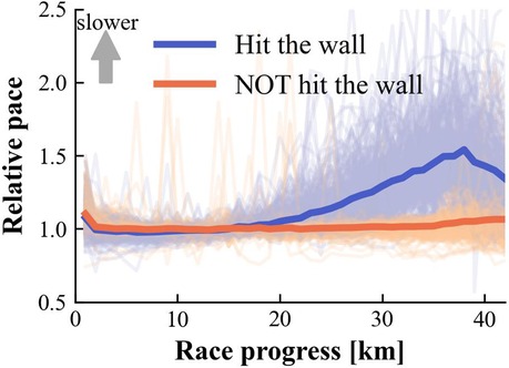 Figure 3. Comparison of relative pace profiles during marathon races between runners who experienced “hitting the wall” and those who did not. The thick blue and orange curves represent mean relative paces of runners who experienced and did not experience “hitting the wall”, respectively. Light-colored curves show individual runner data. Relative pace is expressed as a ratio to each runner's base pace (1.0 = average pace from 5 to 20 km); higher values indicate slower pace.