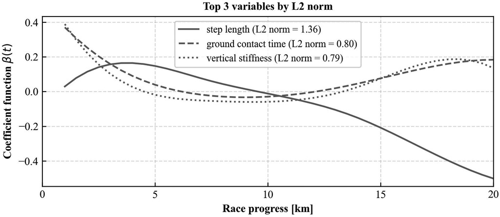 Building upon the current findings, several opportunities for future research are recommended to enhance the model's predictive accuracy and practical utility. First, validation of the model in diverse populations from various regions and across different runner experience levels is essential to confirm its generalizability. Second, integrating additional physiological markers, such as heart rate data, and considering individual metabolic profiles or demographic factors like gender and personal best times may significantly improve predictive accuracy (6) and provide a more comprehensive understanding of the “hitting the wall” phenomenon. Furthermore, incorporating environmental conditions (e.g., ambient temperature, humidity) and course-specific factors (e.g., elevation changes) into the prediction model could account for external influences on biomechanical changes and pace reduction (35–38). Third, while this study utilized L2 norms to quantify the importance of coefficient functions for practical comparison, future methodological advancements should explore more nuanced quantitative measures of variable importance that could offer deeper practical interpretations for runners and coaches. Finally, future studies should explore the real-time implementation of such prediction models using wearable technology to provide immediate feedback to runners during training or races, potentially through smartphone applications. This would facilitate proactive adjustments to running strategy or form, enabling runners to mitigate the risk of severe pace reduction and achieve more consistent performance in endurance events.