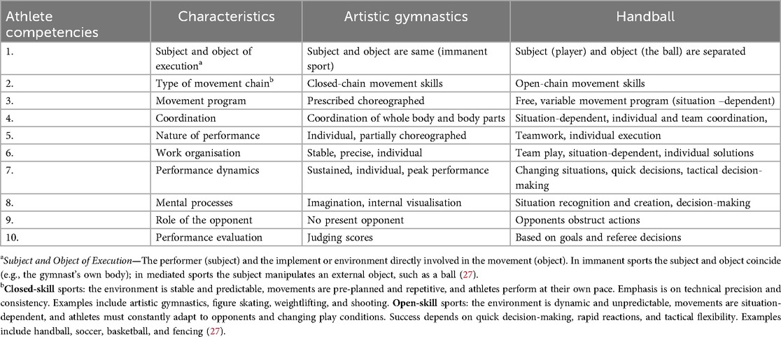 The differences in movement, decision-making, and coordination demands of two sports serve as the foundation for differing competency–ability correlation patterns. For example, athletes in artistic gymnastics emphasize precision, concentration, and body awareness, whereas handball players have placed more emphasis on teamwork, rapid reaction, and decision-making competencies (24, 26).